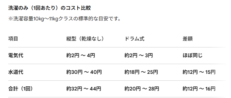 縦型とドラム式の電気代と水道代の差です。